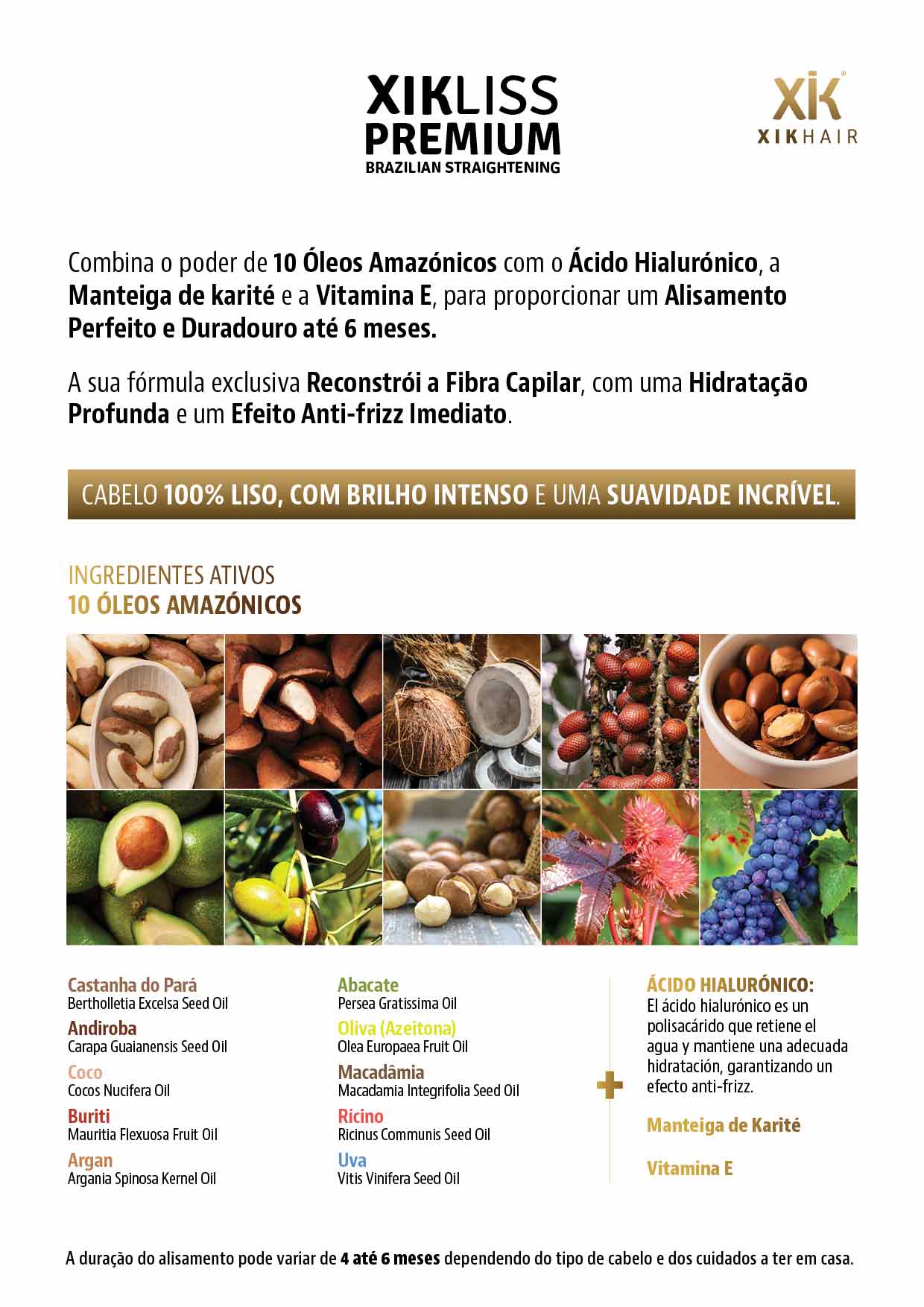 Combina o poder de 10 Óleos Amazónicos com o Ácido Hialurónico, a Manteiga de karité e a Vitamina E, para proporcionar um Alisamento Perfeito e Duradouro até 6 meses.