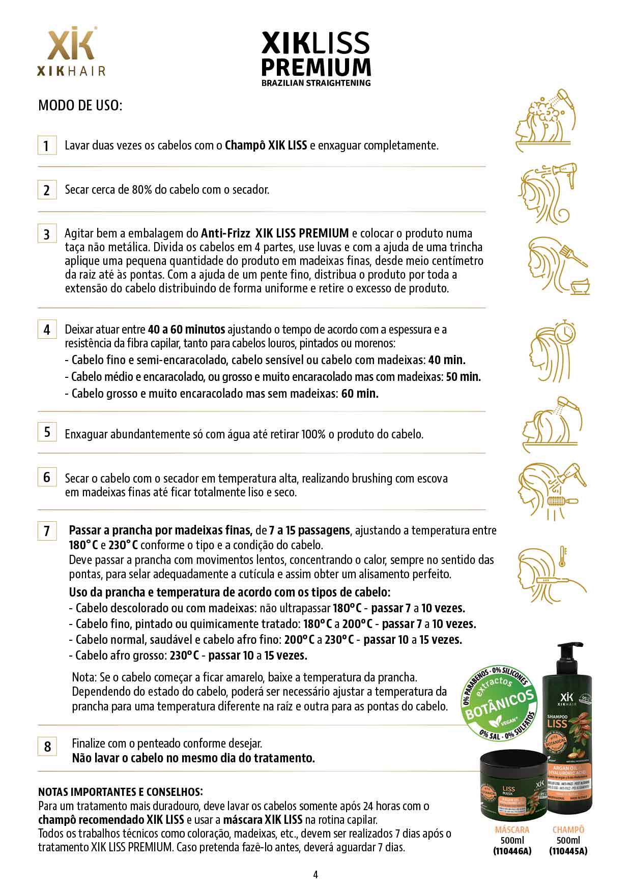 Para um tratamento mais duradouro, deve lavar os cabelos somente após 24 horas com o champô recomendado XIK LISS e usar a máscara XIK LISS na rotina capilar.
