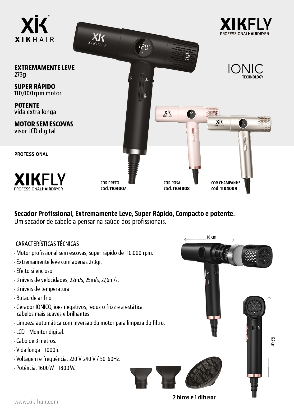 · Gerador IÓNICO, iões negativos, reduz o frizz e a estática,